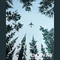 A ground-up perspective of an airplane flying over a clearing in a tree. A unique take on a landscape painting!